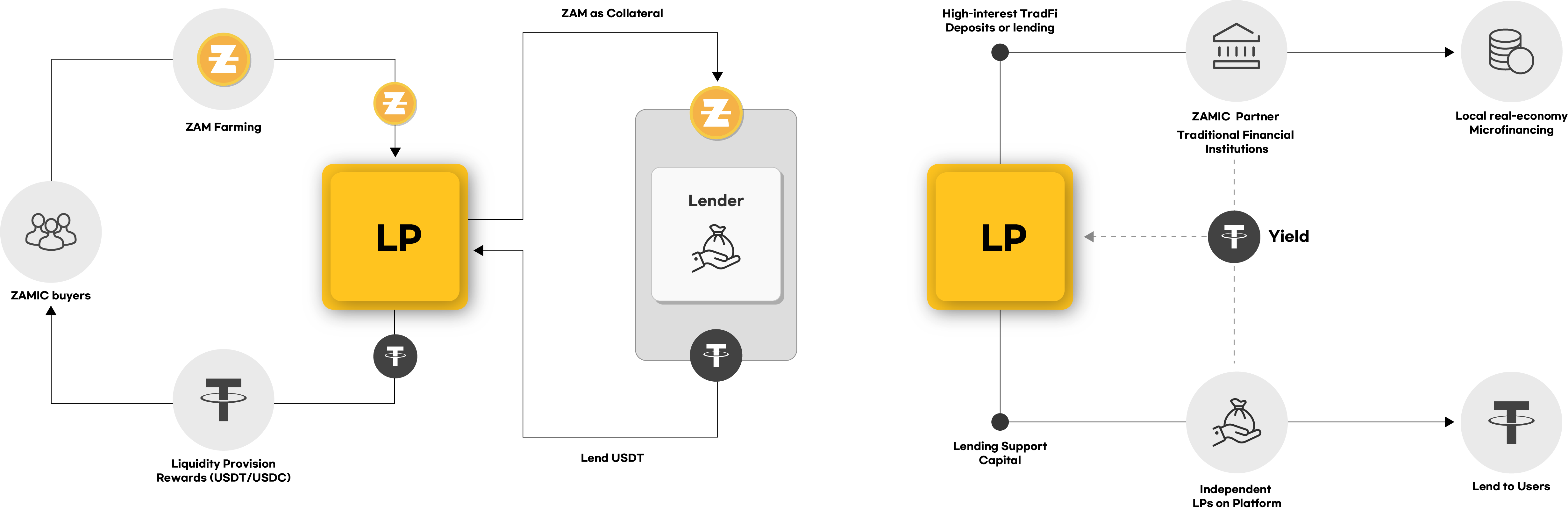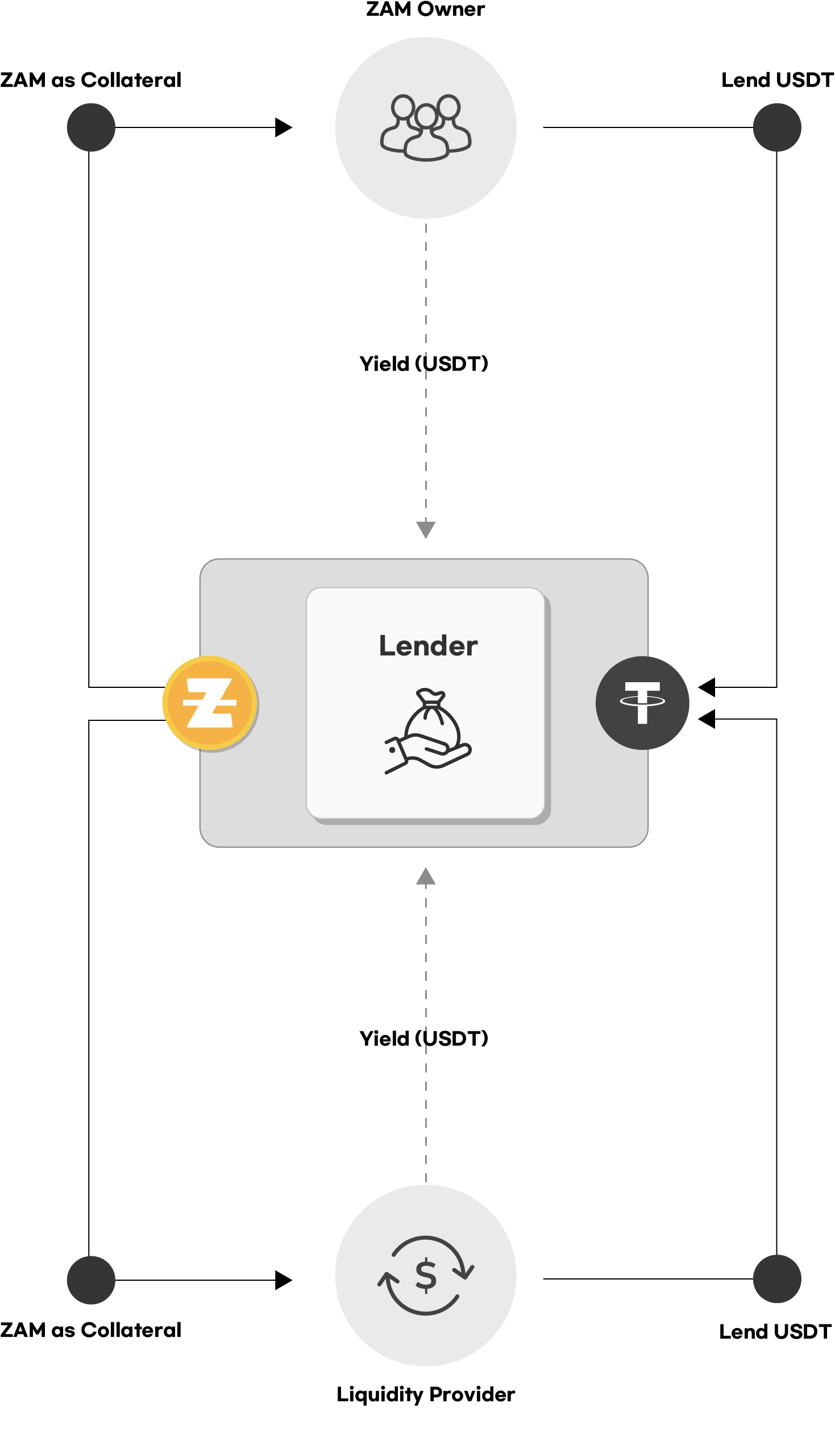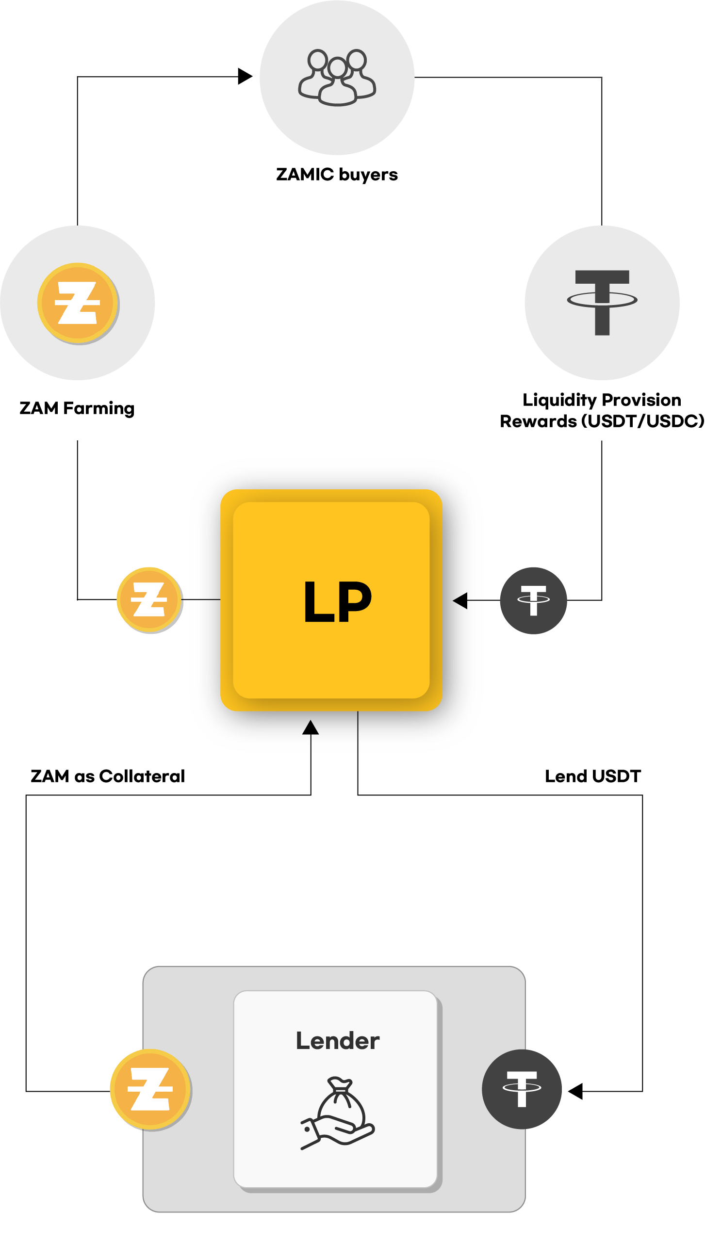 - ZLPs leverage deposited ZAM as collateral to access USDT financing